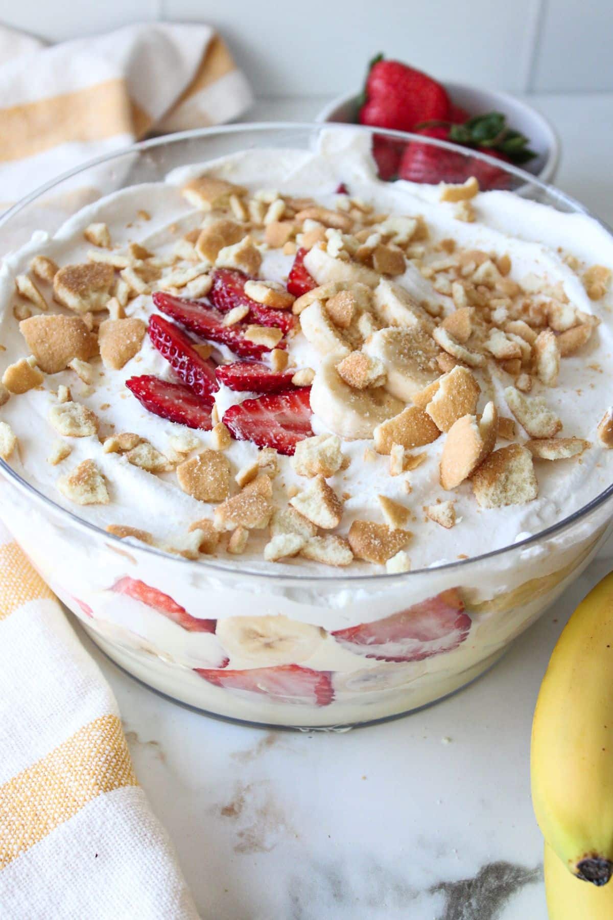 This easy strawberry banana pudding dessert is made with fresh fruit, creamy pudding and a sprinkle of vanilla cookies. It takes 10 minutes to make, plus it’s made a little lighter than traditional layered pudding desserts but it’s just as amazing!