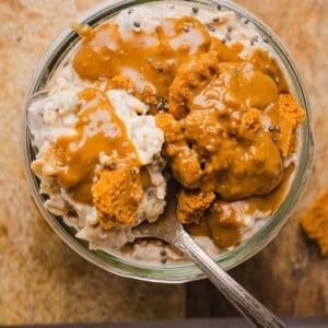 This creamy easy biscoff overnight oats recipe is made with wholesome ingredients like oats and chia seeds plus packed with cookie butter flavor. It’s not only delicious but high protein and high fiber too.