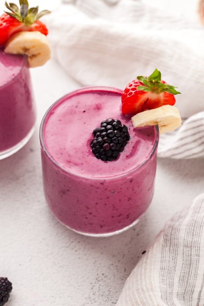 This high protein high fiber blackberry smoothie recipe is perfect for busy mornings when you need a one-handed breakfast. It’s made with berries and bananas plus packed with antioxidants, fiber and protein to keep you full.