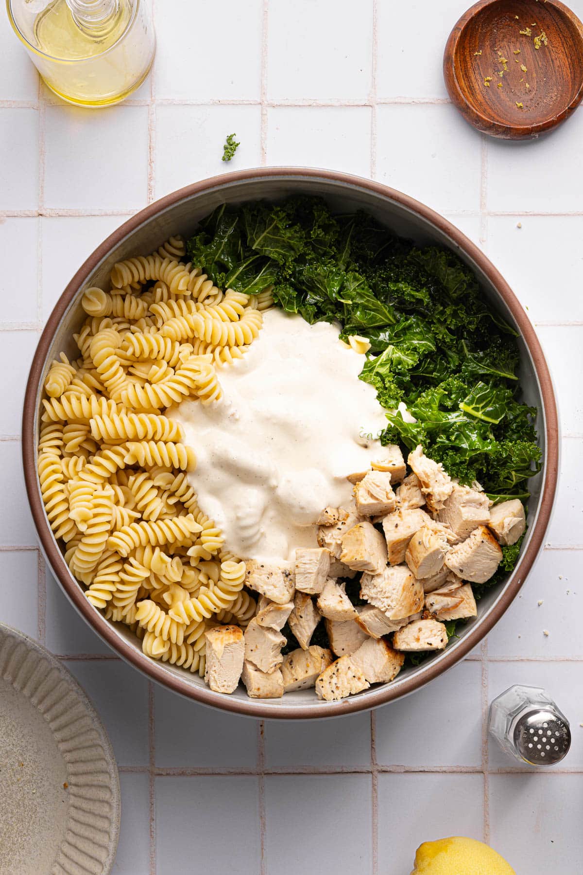 - Add cooked pasta and chicken to the kale in the large bowl. Toss gently until everything is thoroughly coated in dressing. Add shaved parmesan last and toss gently until incorporated.