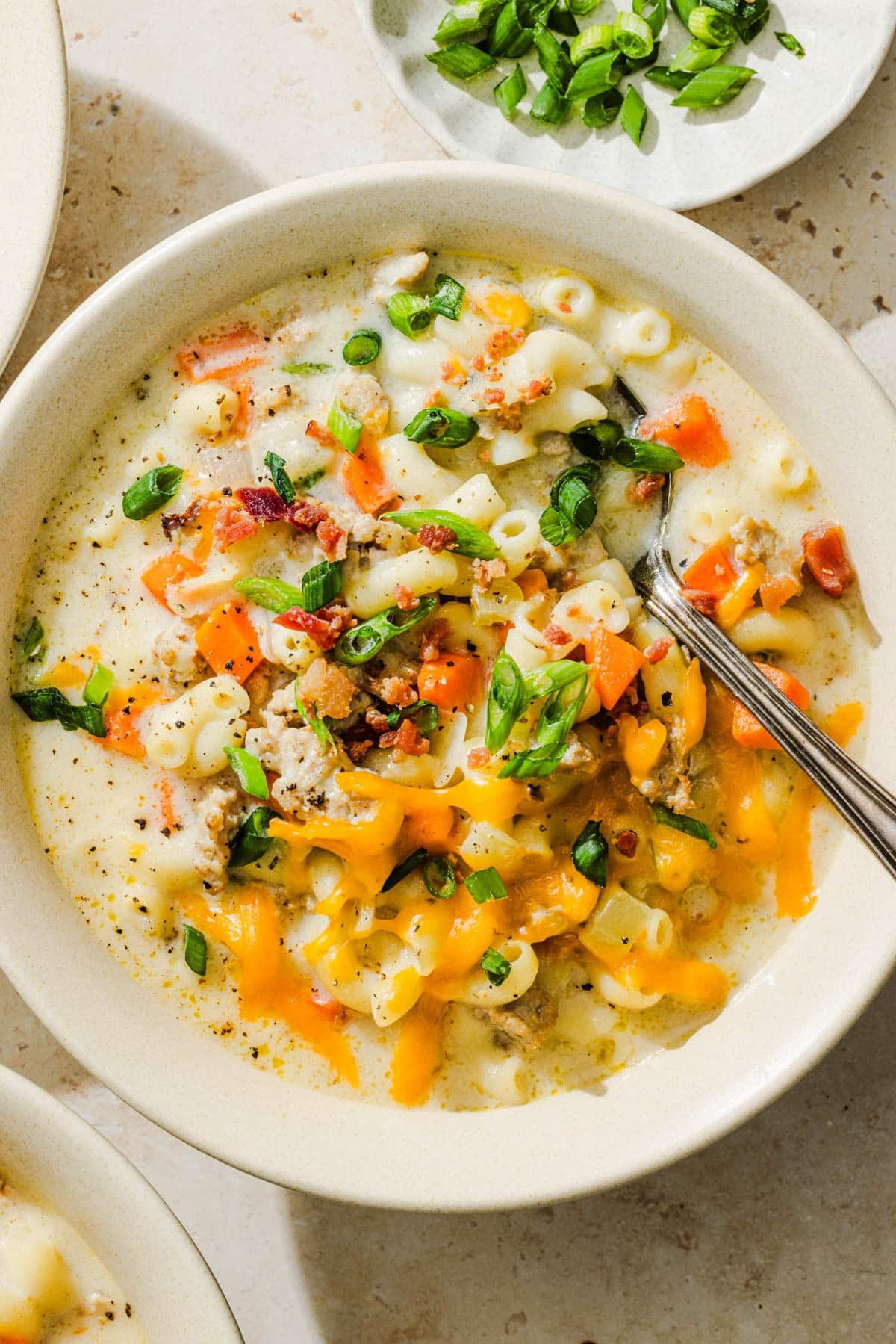 - A comfort meal you can feel good about. This soup has all the rich indulgent flavor of a cheeseburger and mac and cheese combined in one cozy bowl. It’s made with ground turkey instead of beef and milk instead of heavy cream.